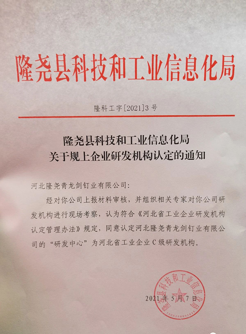 經(jīng)對你公司上報(bào)材料審核, 并組織相關(guān)專家對你公司研發(fā)機(jī)構(gòu)進(jìn)行現(xiàn)場考察, 認(rèn)為符合 《河北省工業(yè)企業(yè)研發(fā)機(jī)構(gòu)認(rèn)定管理辦法》規(guī)定,同意認(rèn)定河北隆堯青龍劍釘業(yè)有限公司的 "研發(fā)中心" 為河北省工業(yè)企業(yè)C 級研發(fā)機(jī)構(gòu)。