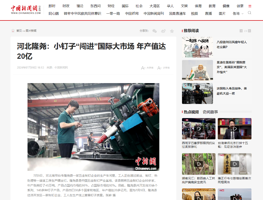 近日,中國新聞網(wǎng)記者走進河北隆堯青龍劍釘業(yè)有限公司,對制釘車間的生產(chǎn)工序及車間環(huán)境進行了解和拍攝。7月9日下午,青龍劍釘業(yè)榮登中國新聞網(wǎng)。青龍劍釘業(yè)將不斷探索、研發(fā)產(chǎn)品,通過技術升級、產(chǎn)品創(chuàng)新,為社會提供更高效、更安全緊固產(chǎn)品,提供更全面的基材連接緊固系統(tǒng)解決方案,樹立行業(yè)標桿,助力國家建設![詳情] 2024-07-12 09:40:06